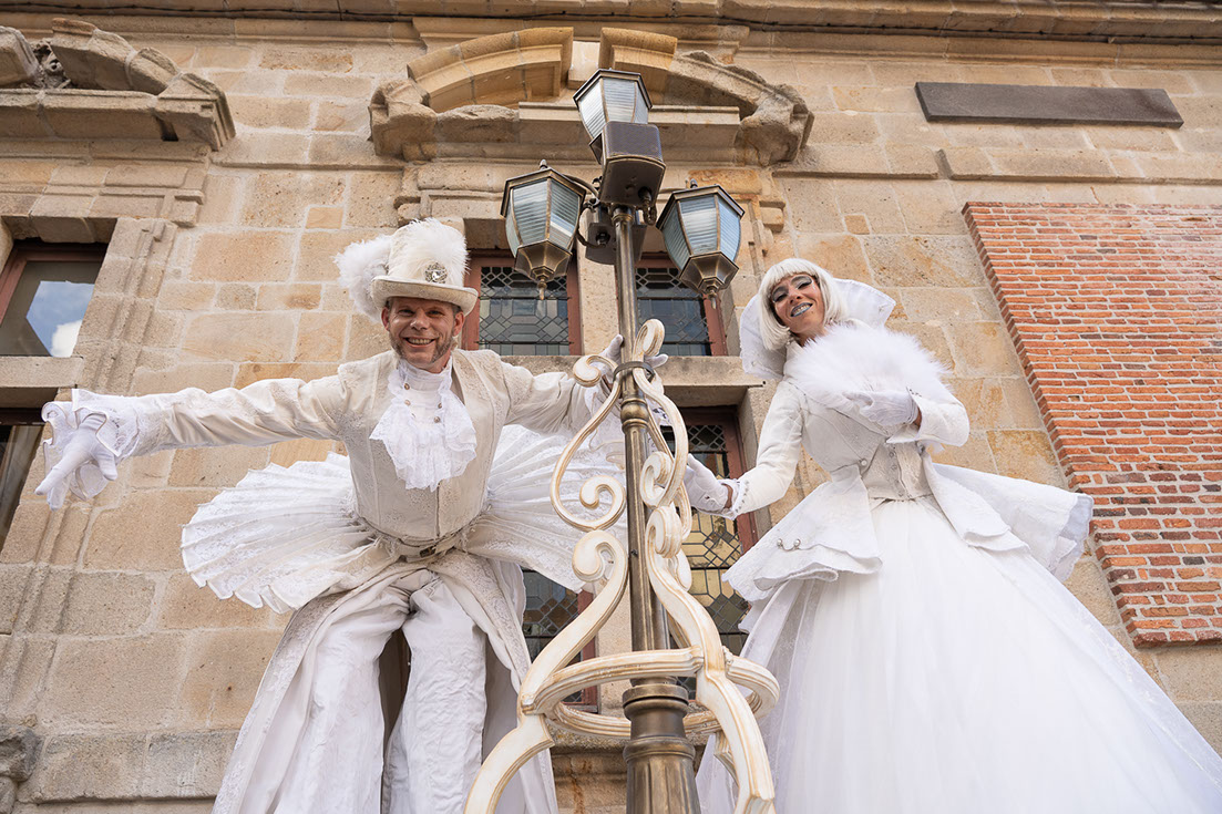 Astraïa vous convie à un voyage empreint de pureté et de poésie. Surplombant de leurs échasses, ces personnages élégants et scintillants vous offriront un subtil aperçu de leur raffinement.
